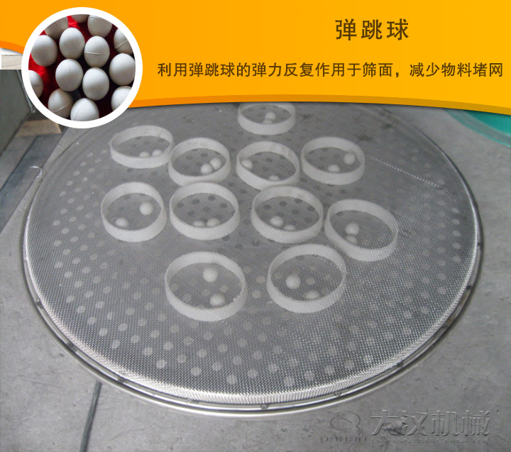 彈跳球是超聲波振動篩、不銹鋼振動篩等產品里的清網配件,在投料多的情況下,篩面壓力變大,篩分速度會變慢,有彈跳球在篩網下面不斷撞擊篩網,可以加速物料的篩分。