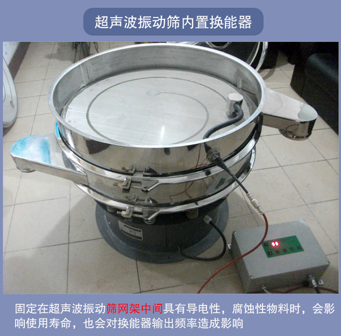 超聲波振動篩外置換能器:因其安裝在篩框外部,不會與物料產(chǎn)生直接的接觸,能有效提升篩分效率,可以篩分內(nèi)置換能器所不能篩分的具有導(dǎo)電性強、含腐蝕性的物料。