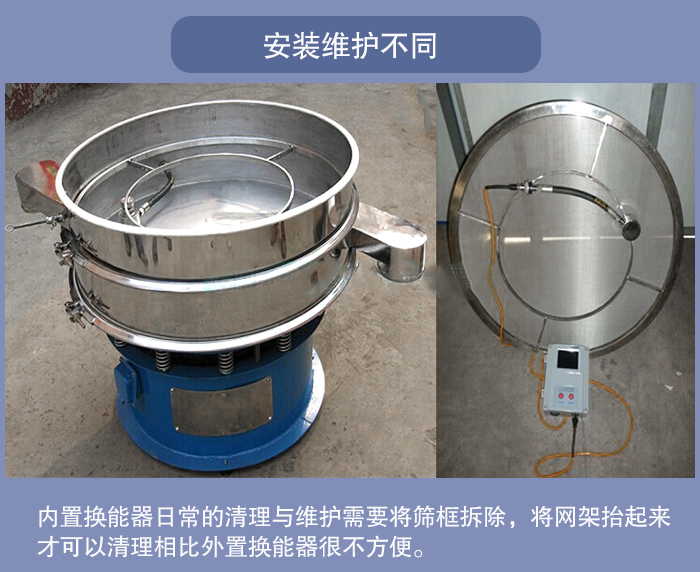 超聲波振動篩內(nèi)置換能器:一般直接固定在超聲波振動篩網(wǎng)架中間,日常的清理與維護需要將篩框拆除,將網(wǎng)架抬起來才可以清理相比外置換能器很不方便。